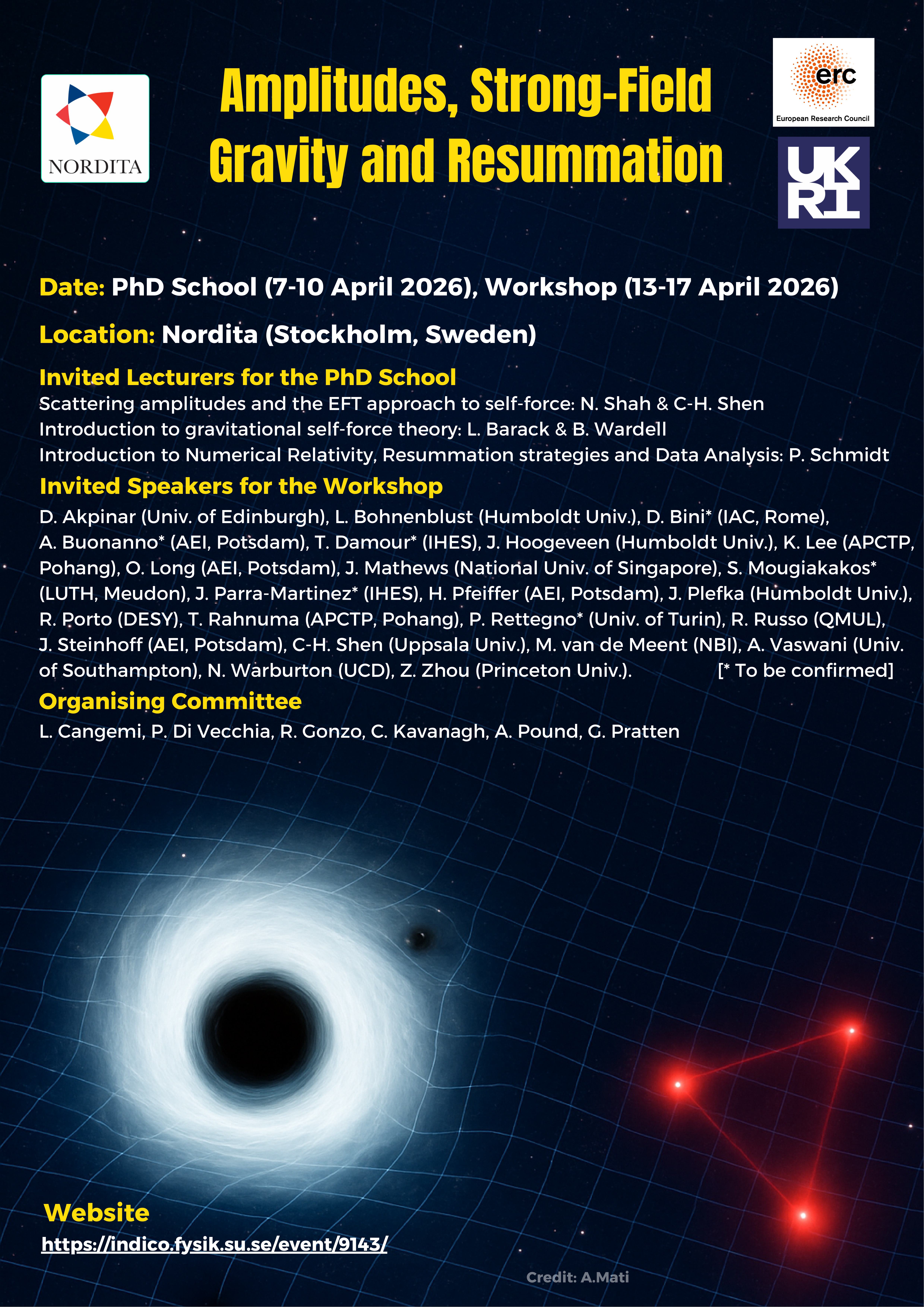 2026 ![]() | Organizer — Nordita program Amplitudes, Strong-Field Gravity, and Resummation (link) Nordita Institute, Stockholm |